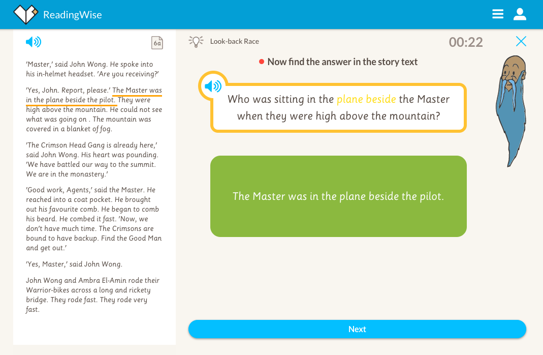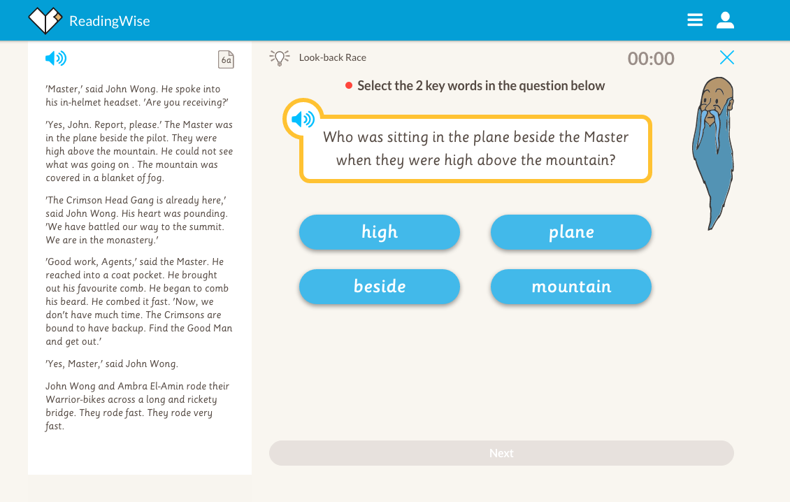 Look-back works on answering questions effectively. The aim of the look-back race mini-skill is to introduce, hone and consolidate skimming and scanning, identifying key words in a question, and then finding these key words in a text along with the answer. This technique is often used to answer literal questions. As The Master says: