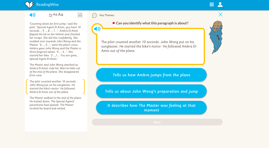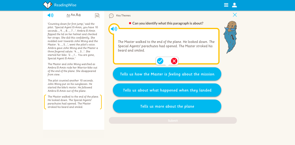 Learners have to identify what the selected paragraph is about. The idea is to be able to focus on the paragraph, evaluate, and pull out the main themes while putting aside details which aren’t so relevant. They are given three answers to choose from, each a summary of the paragraph which may be correct or incorrect.