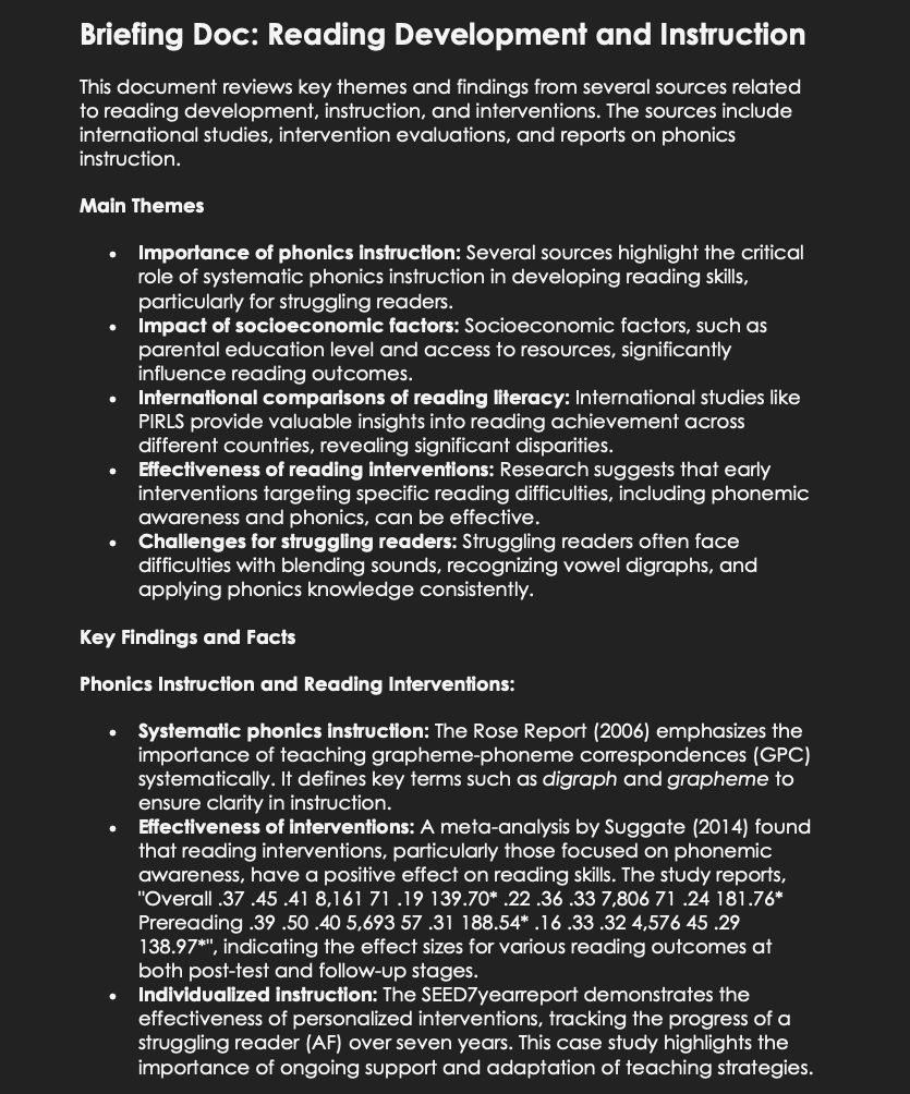 Google’s new NotebookLM is turning heads (perhaps more 'pricking ears') with its innovative features. Its ability to create podcast-style audio files, transforming static notes into a dynamic, spoken-word format, is quite impressive. I've put this to the test by using the familiar topic of 'the effectiveness of phonics instruction in reading development.'