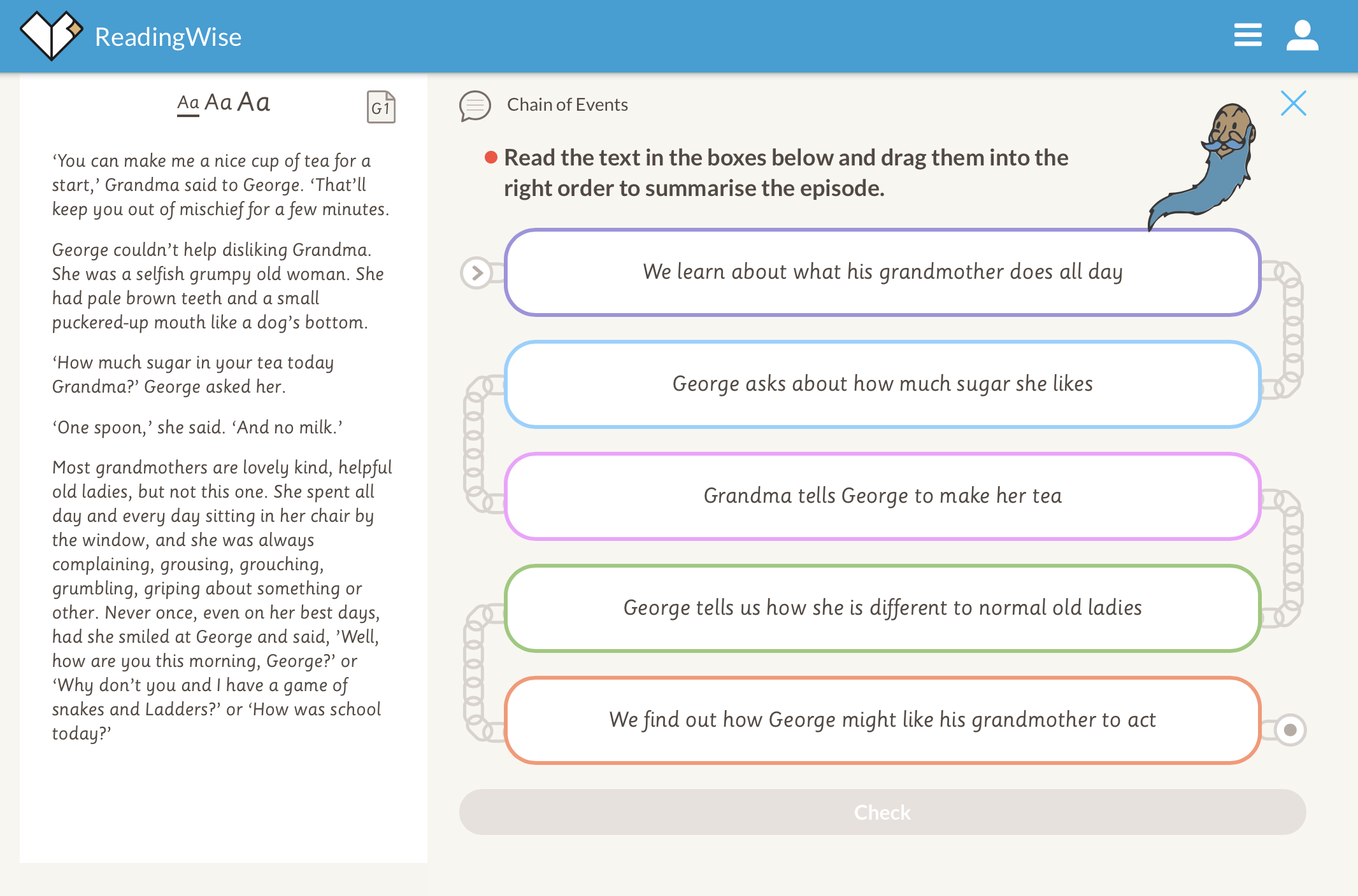 4. Chain of Events. Now for 'Chain of Events'. Being able to order events and actions in a story helps us to understand it. In this activity you need to put the events in order! https://app.readingwise.com/super/toolkits/216