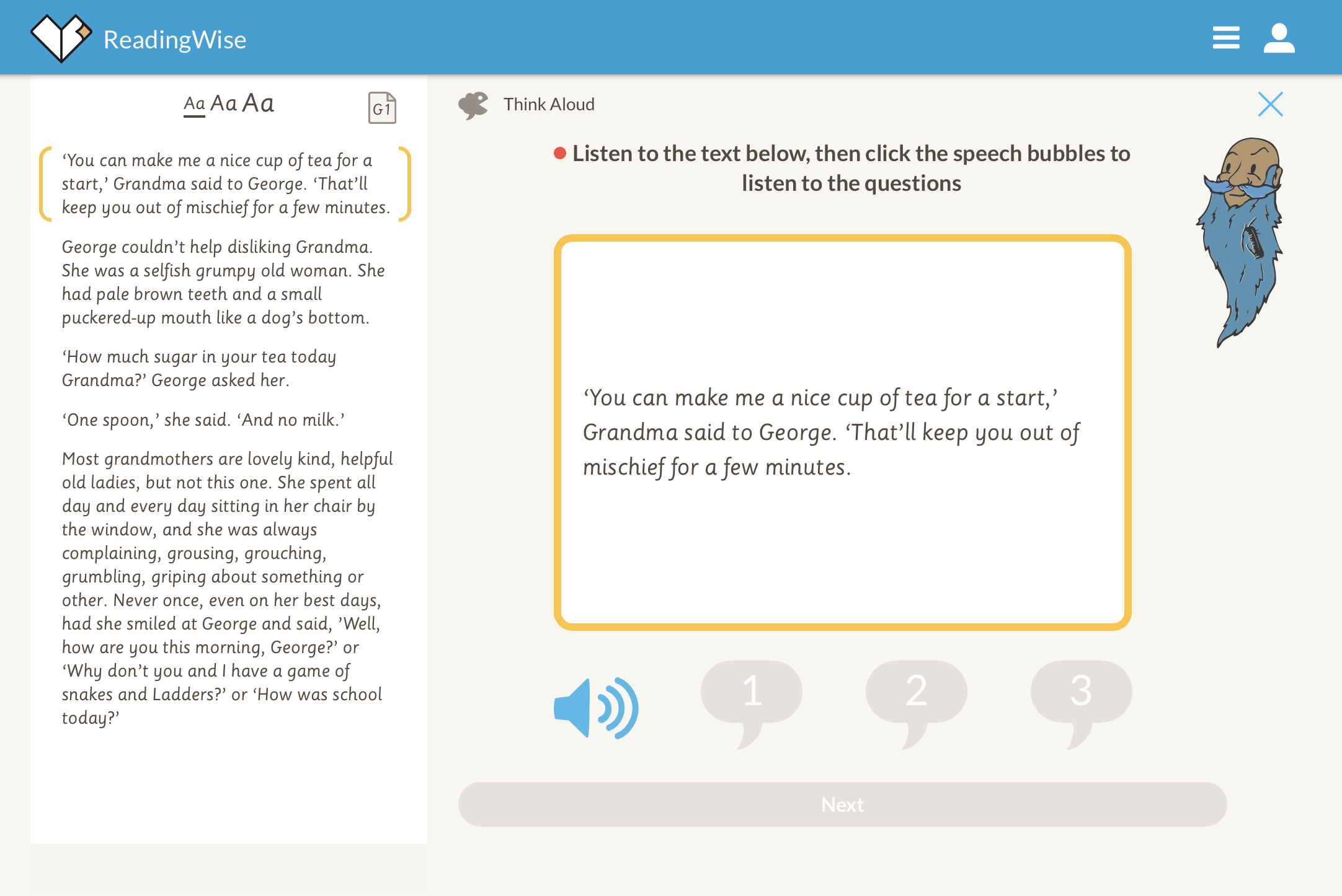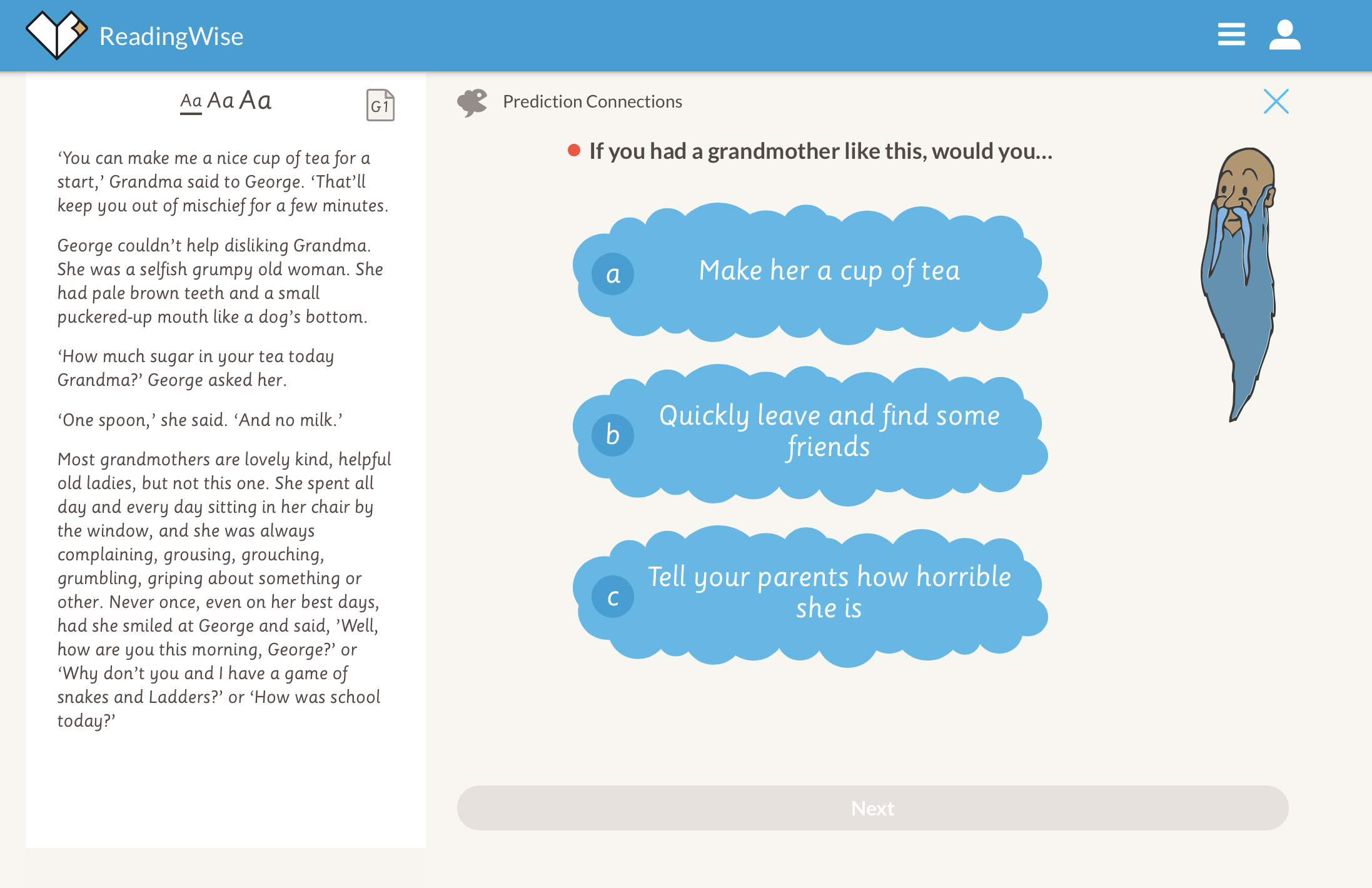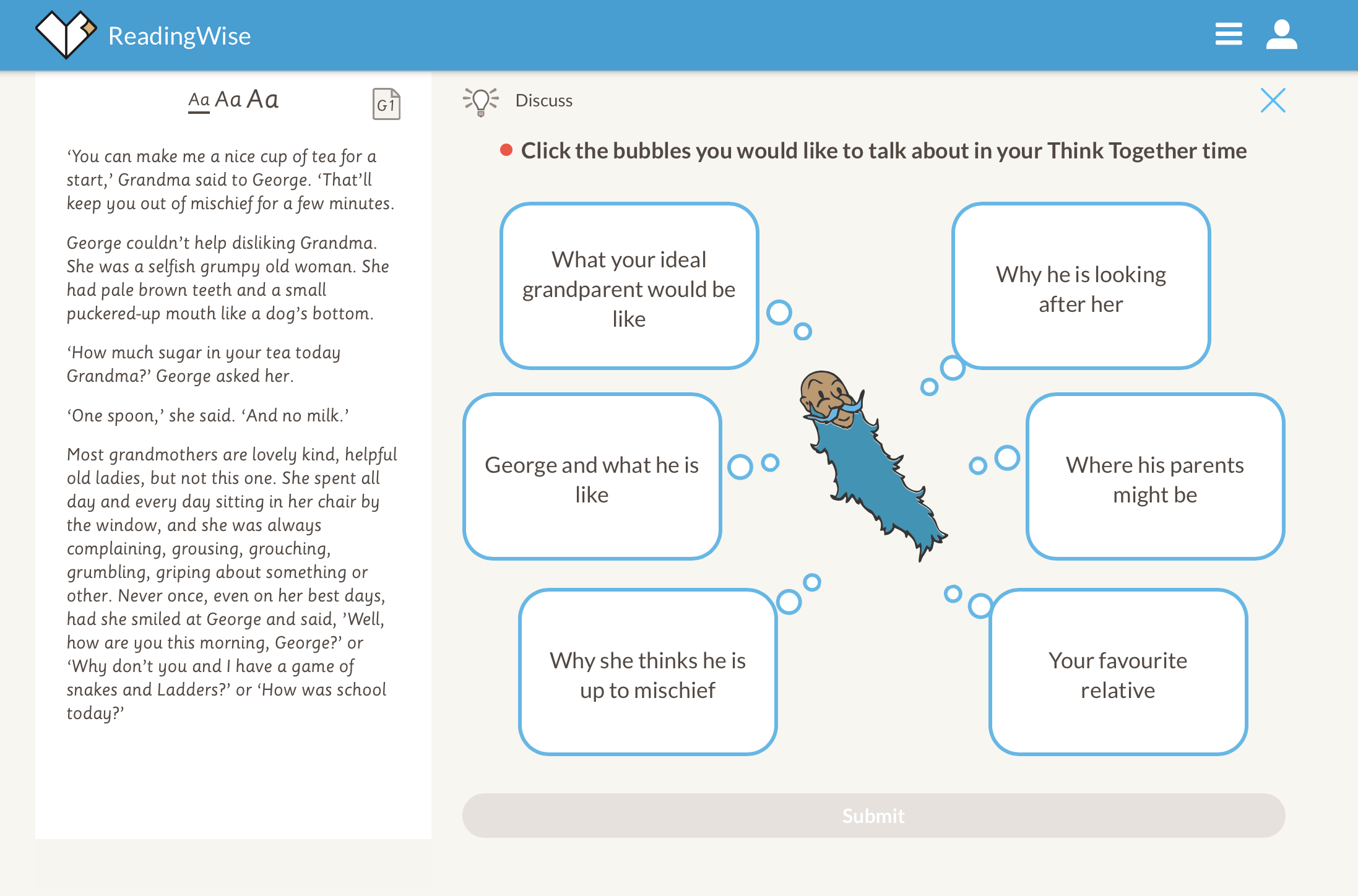 4. Discuss. Now for 'Discuss'. This activity is all about raising your own questions. Why does Grandma think George is up to mischief? What would you discuss? https://app.readingwise.com/super/toolkits/210