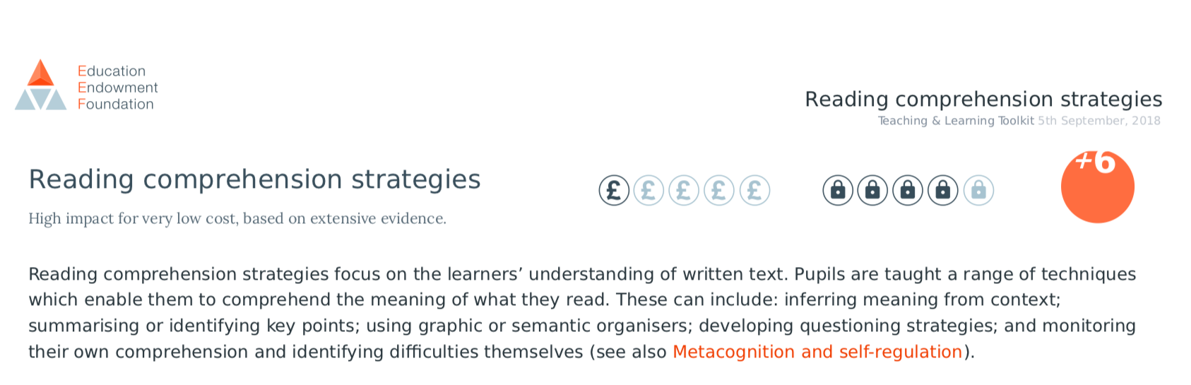 According to the Education Endowment Foundation toolkit: "On average, reading comprehension approaches deliver an additional six months’ progress. Successful reading comprehension approaches allow activities to be carefully tailored to pupils’ reading capabilities, and involve activities and texts that provide an effective, but not overwhelming, challenge."