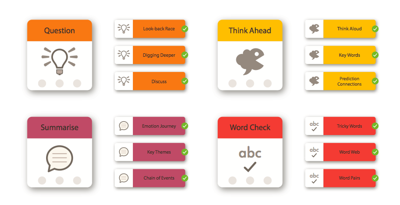 Evidence points to learning strategies to improve comprehension like questioning and thinking ahead. At ReadingWise, we call these strategies Mega-skills and there are four Mega-skills in the Comprehension programme. Each Mega-skill has 3 Mini-skills. Here they are: