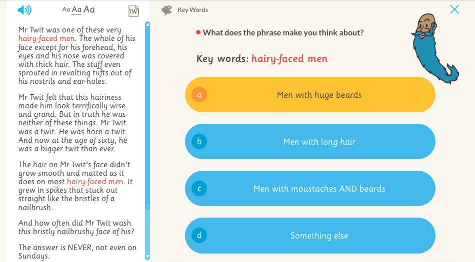 Below you'll find an image of each of the 12 comprehension 'mini-skills'. This example is taken from Dahl's, The Twits.